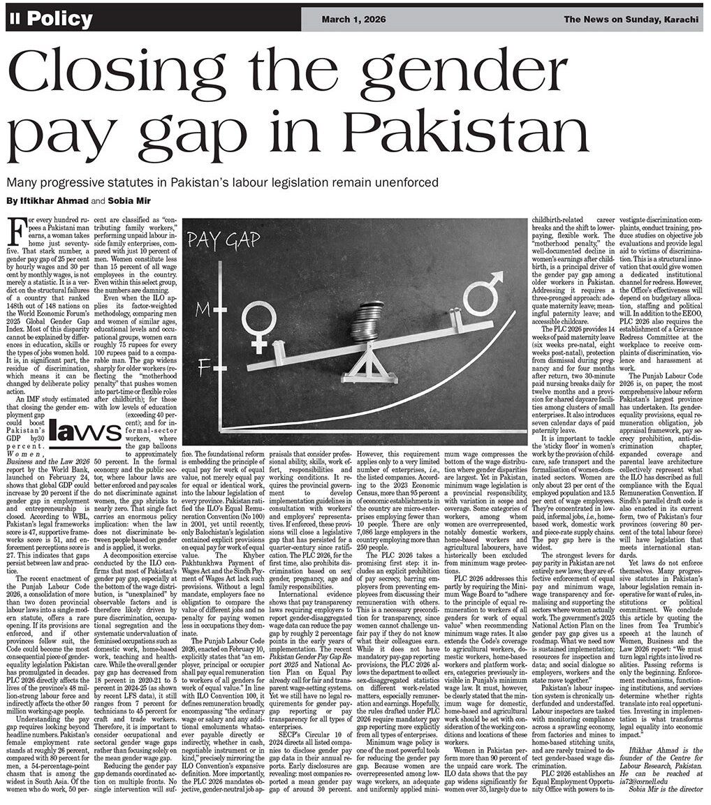 International evidence shows that pay transparency laws requiring employers to report gender-disaggregated wage data can reduce the pay gap by roughly 2 percentage points in the early years of implementation. The recent Pakistan Gender Pay Gap Report 2025 and National Action Plan on Equal Pay already call for fair and transparent wage-setting systems. Yet we still have no legal requirements for gender pay-gap reporting or pay transparency for all types of enterprises.