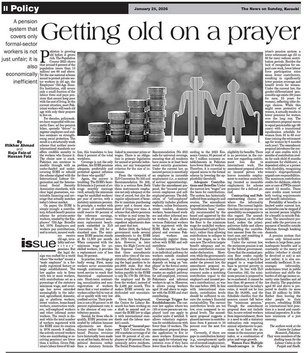 A pension system that covers only formal-sector workers in large firms, pays inadequate benefits and is constantly at the mercy of politics (whether it should be devolved or not) is not just unfair; it is also economically inefficient. It encourages informality, undermines trust in public institutions and shifts the burden of old-age income security onto families and ad hoc charity. The population aged 60 and above is projected to double (to more than 25 million) by 2030. Rather than leaving the older people to their prayers, rebuilding EOBI on international best practices is a moral and constitutional imperative. It is the bare minimum of a just economy.